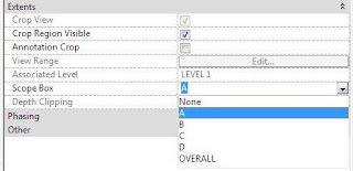To assign a scope box to a new view, change the view’s properties under ‘Extents’: